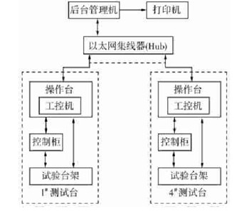 后臺管理機用于管理多個操作臺中的測試試驗據。通過后臺管理機,可備份操作臺工控機中的試驗數據,對測試數據可進行各種查詢,匯總、打印各種報表等,避免了逐個查詢每一測試臺工控機中數據的繁瑣操作,也有利于保證測試數據的安全性。操作臺主要完成各參數的測量、各種試驗狀態(tài)的讀取和判斷,控制測試系統(tǒng)完成各種試驗項目??刂乒裰邪惭b了執(zhí)行機構,主要功能是執(zhí)行操作臺工控機發(fā)出的指令,完成對試驗對象的控制。