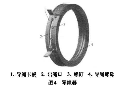 出現(xiàn)此種情況,是導(dǎo)繩器發(fā)生故障導(dǎo)致。導(dǎo)繩器安裝在卷筒上,其作用是使鋼絲繩從卷筒上順利排出和纏繞,并防止在此過程中鋼絲繩亂繩。導(dǎo)繩器是易損件,當(dāng)其磨損嚴重時,就起不到導(dǎo)繩的作用而發(fā)生亂繩,此時應(yīng)及時更換導(dǎo)繩器(見圖4)。當(dāng)傾斜起吊重物時,最容易使導(dǎo)繩器磨損,在生產(chǎn)中應(yīng)使吊裝的重物與電動葫蘆垂直。