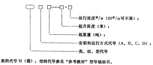 電動葫蘆的型號標注通常有四大項:類組型、特性代號、主參數(shù)和運行速度,根據(jù)JB2393-2394-78規(guī)定,鋼絲繩電動葫蘆型號標注如下: