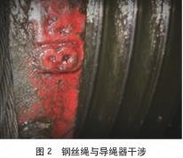 1)升降機(jī)運(yùn)行異響來源于鋼絲繩與導(dǎo)繩器的干涉(如圖 2 所示),由于吊鉤與貨廂龍門架吊耳的安裝位置不合理,致鋼絲繩處于斜拉狀態(tài),使導(dǎo)繩器與鋼絲繩干涉,造成導(dǎo)繩器排繩效果不良,使鋼絲繩脫離卷筒繩槽,發(fā)生鼓包現(xiàn)象。升降機(jī)的沖頂使電動葫蘆外殼變形,故造成鼓包處鋼絲繩與電動葫蘆變形外殼干涉,導(dǎo)致該處鋼絲繩磨損斷絲。