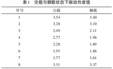 檢測時,電動葫蘆應(yīng)處于規(guī)定的運行狀態(tài),即電動葫蘆在額定轉(zhuǎn)速、額定電壓下的穩(wěn)定工作狀態(tài)。如果所測振動大于該方法所允許接受的范圍,且受過度背景干擾,應(yīng)停機(jī)進(jìn)行檢測,以確定外界的影響程度。機(jī)器靜止時所測振動烈度值(速度的均方根值)超過運行時的25%,必須進(jìn)行修正,以減少背景振動對檢測的影響。本研究選擇鋼絲繩電動葫蘆空載時對其運行狀況進(jìn)行檢測??蛰d運行時,將采用振動檢測的方法得到的速度的均方根值中最大值作為參考數(shù)值。此外,對選擇在空載還是帶載的情況下對電動葫蘆進(jìn)行檢測也進(jìn)行了研究。對電動葫蘆減速箱進(jìn)行檢測的同時,不考慮電動葫蘆沿軌道運行的情況,因為這時減速箱并不工作,而只考慮電動葫蘆的空載升降、帶載升降狀態(tài)。針對這樣的狀況,在試驗過程中選取了8臺電動葫蘆,分別對這8臺電動葫蘆空載上升、額載上升的兩種穩(wěn)定的工作狀態(tài)進(jìn)行振動檢測,得到振動烈度、方根幅值、平均幅值這三個主要參數(shù),并分析上述兩種狀態(tài)下這三個參數(shù),參數(shù)與分析見表1、表2、表3